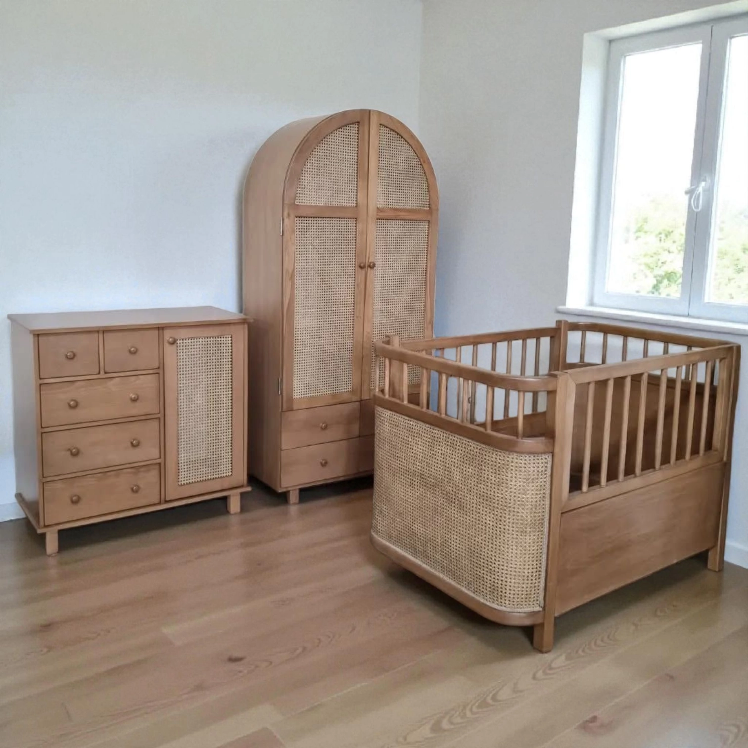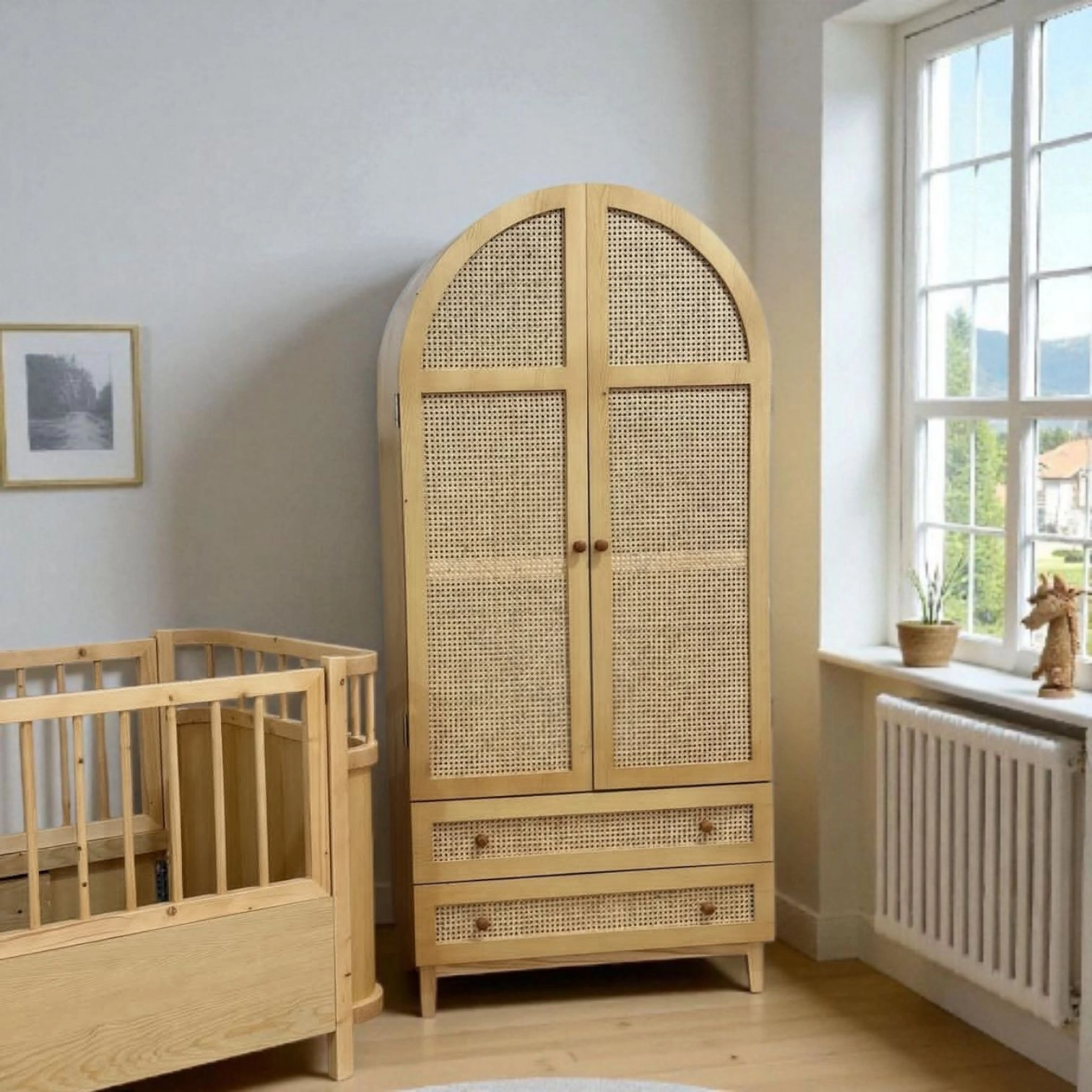دو کشو حصیری: دو کشوی جادار در پایین کمد با نمای حصیری، فضایی ایدهآل برای نگهداری لباسها، اسباببازیها یا وسایل کوچکتر کودک فراهم میکند.