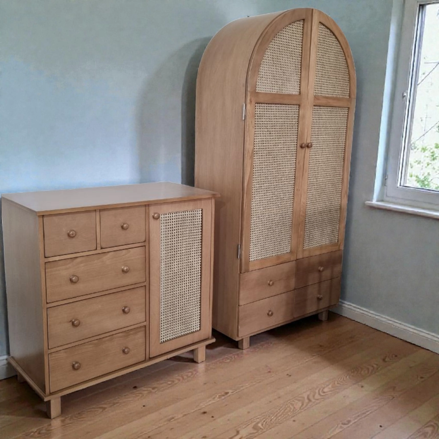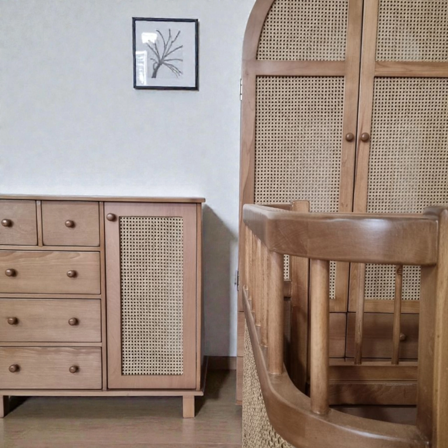 طراحی چندکاره و بهینه: این دراور با چهار کشو با عمق مناسب و یک کمد جادار با درب حصیر بامبو، فضای بینظیری برای سازماندهی انواع لباس، پوشک، اسباببازی و لوازم شخصی کودک فراهم میکند. درب حصیر بامبو علاوه بر زیبایی، به گردش هوا در کمد کمک کرده و دسترسی آسان به وسایل را ممکن میسازد.