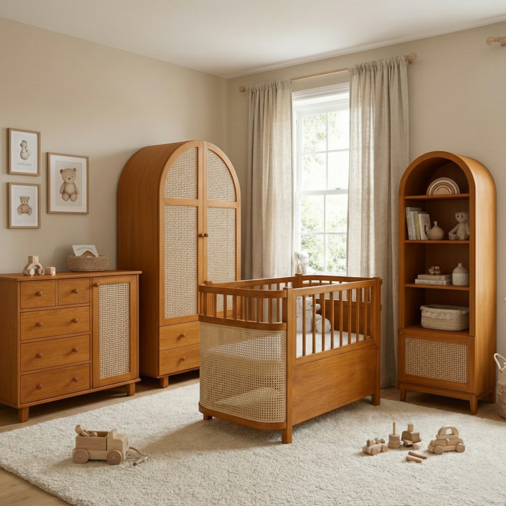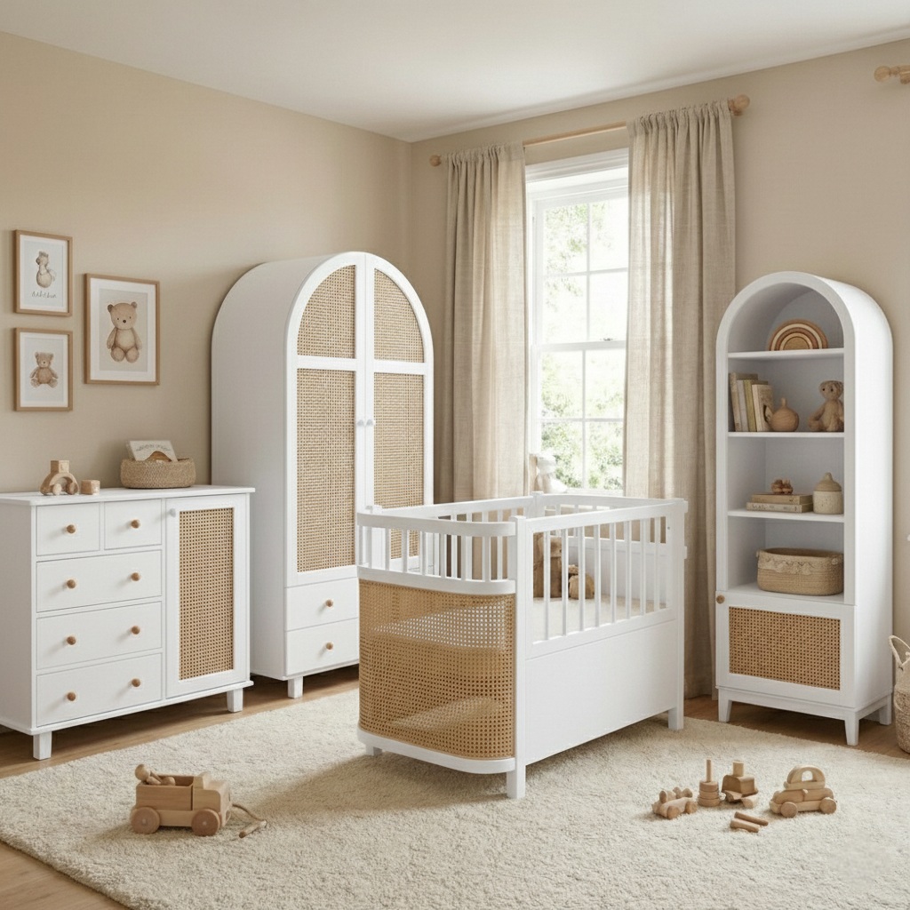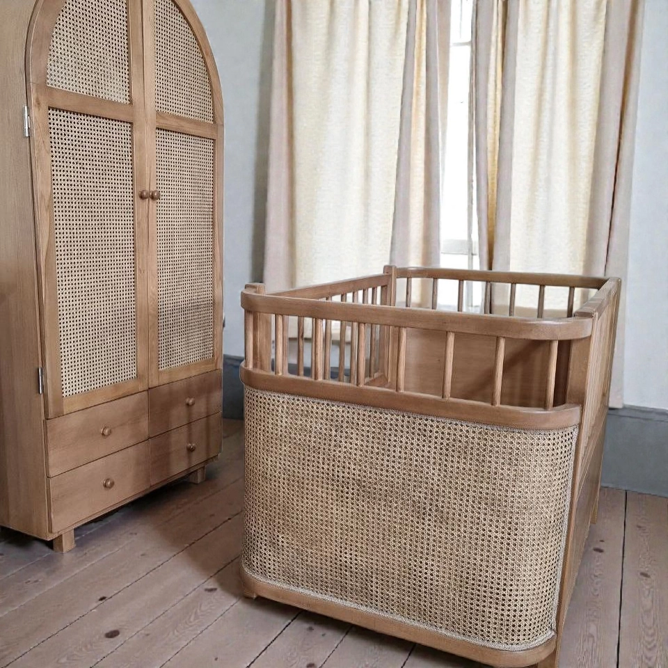 سرویس اتاق کودک مدل S2 یک مجموعه کامل و هماهنگ برای تجهیز اتاق دلبند شماست. این سرویس با ترکیب چوب طبیعی، طراحی گنبدی مدرن و حصیر بامبو، فضایی گرم، لوکس و کاربردی را در طول سالهای رشد کودک شما فراهم میکند.