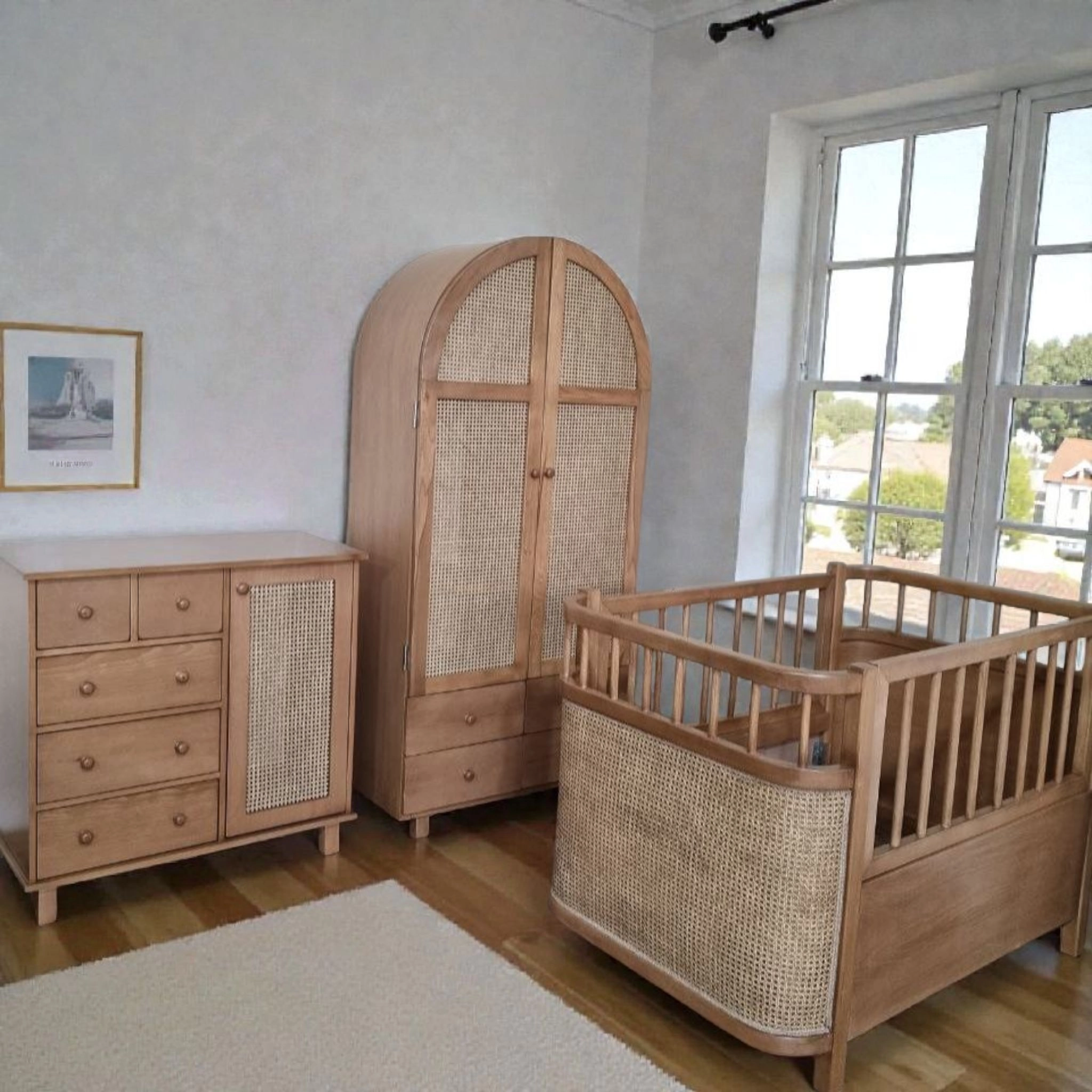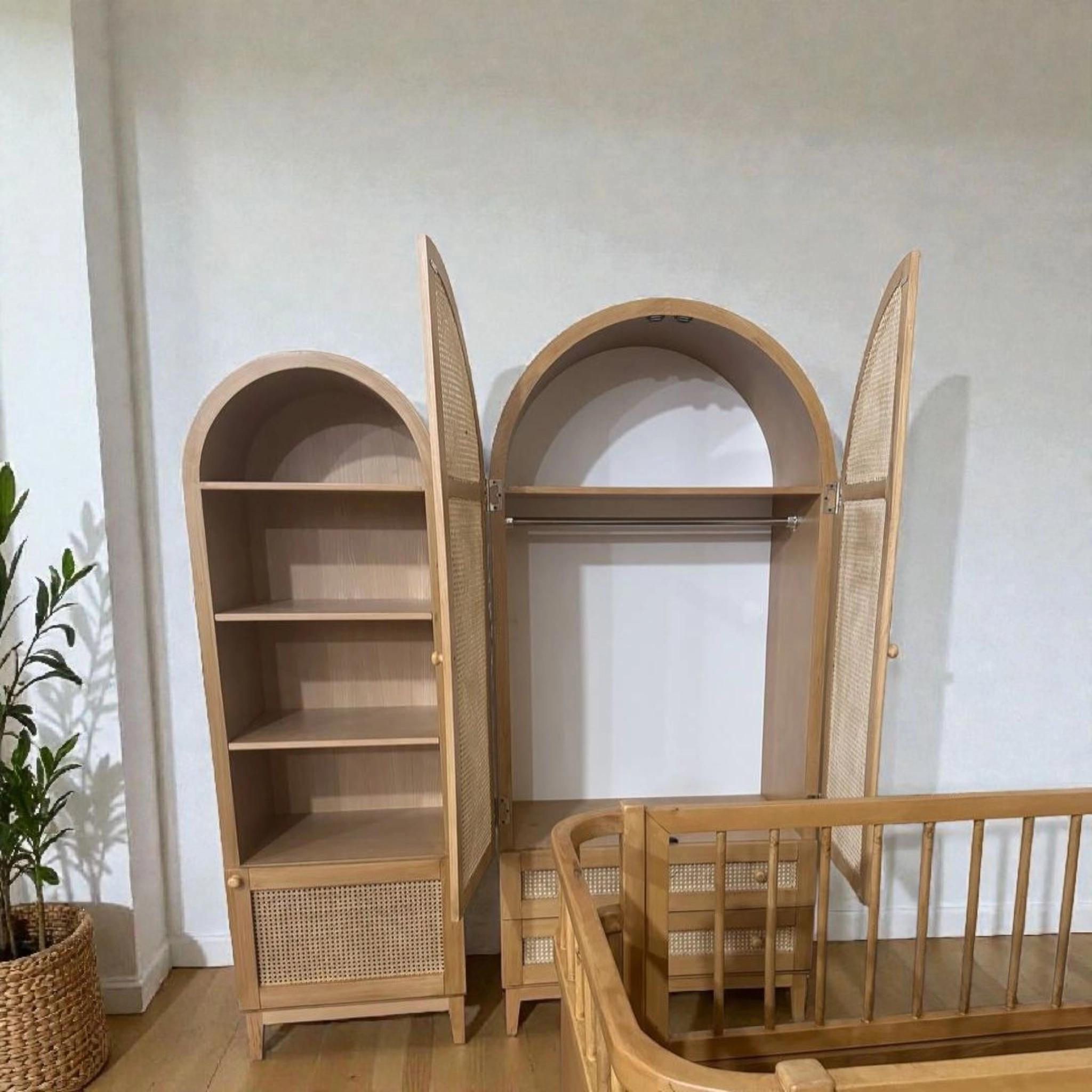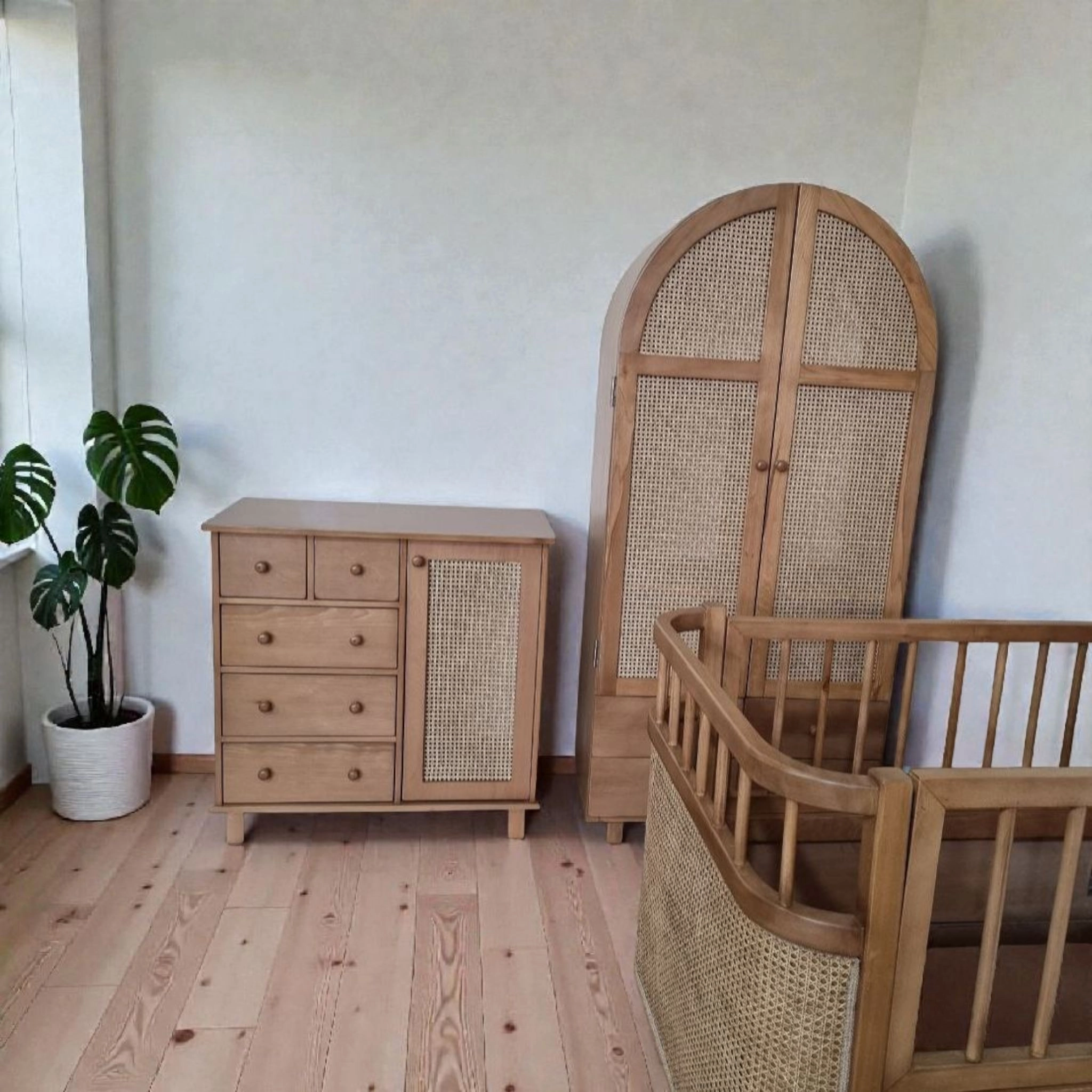 سرویس اتاق کودک مدل S2 یک مجموعه کامل و هماهنگ برای تجهیز اتاق دلبند شماست. این سرویس با ترکیب چوب طبیعی، طراحی گنبدی مدرن و حصیر بامبو، فضایی گرم، لوکس و کاربردی را در طول سالهای رشد کودک شما فراهم میکند.